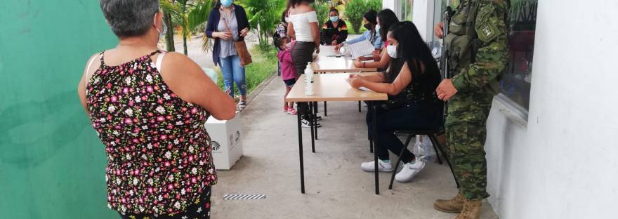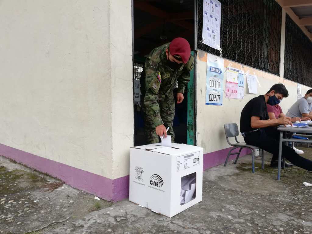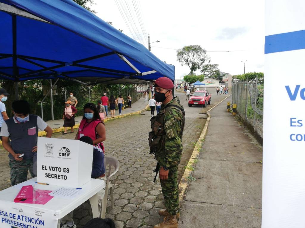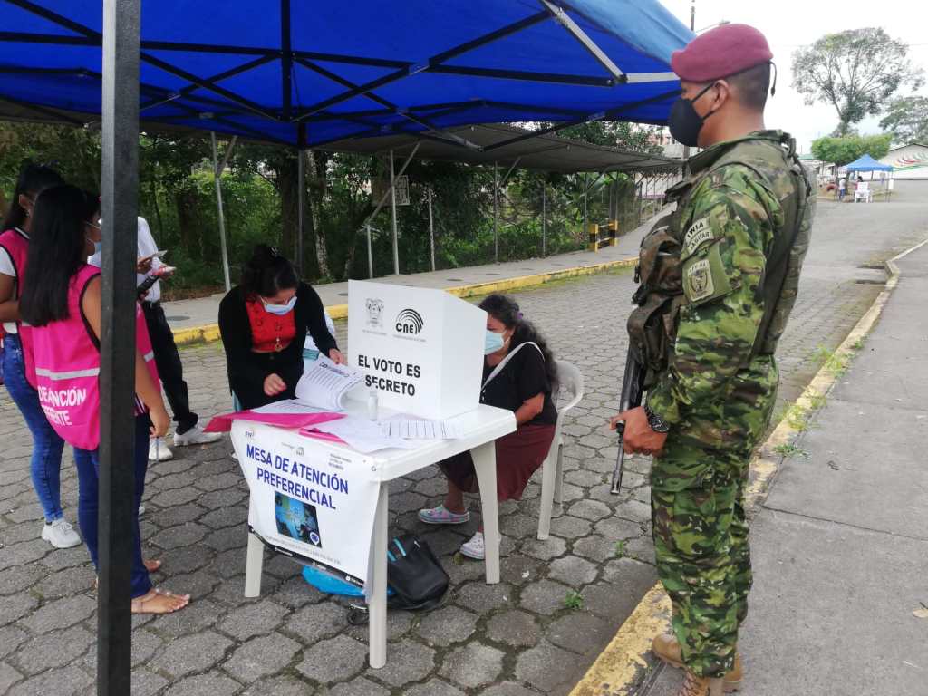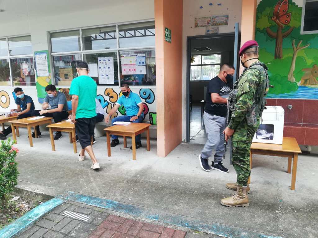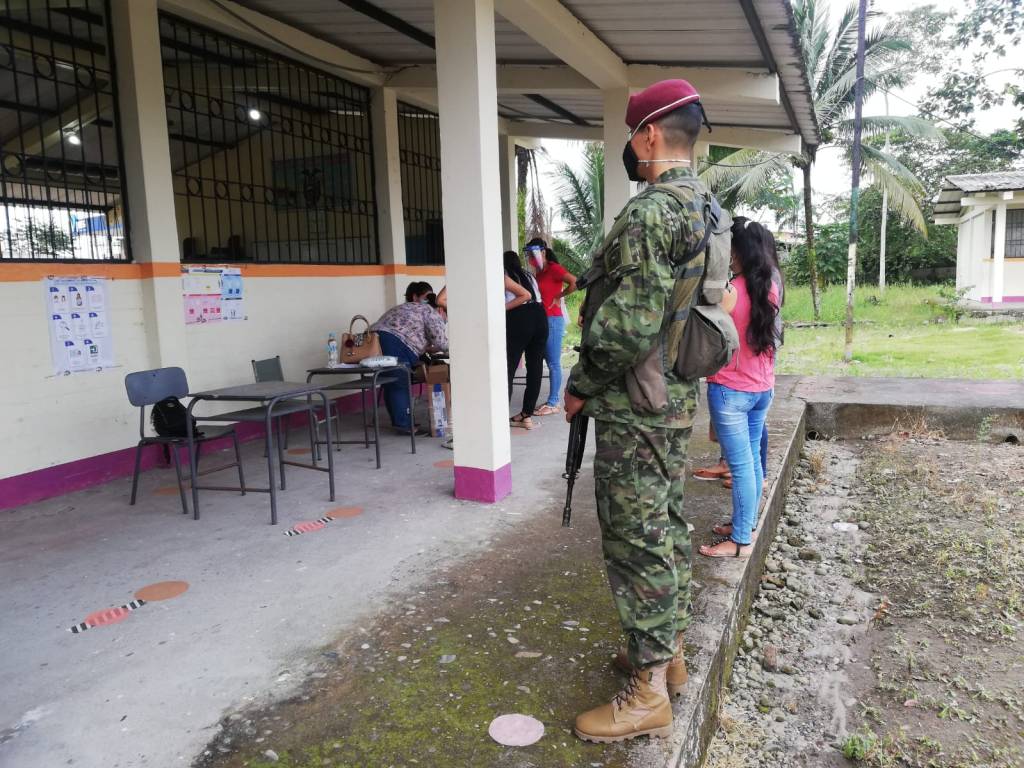 El Grupo de Fuerzas Especiales Nº 53 Rayo en apoyo al CNE de sucumbios se encuentra brindando la seguridad en los diferentes recintos electorales de Nueva Loja, garantizando el normal desarrollo del sufragio de la ciudadanía, quienes cumplen con el distanciamiento y protocolos de bioseguridad.