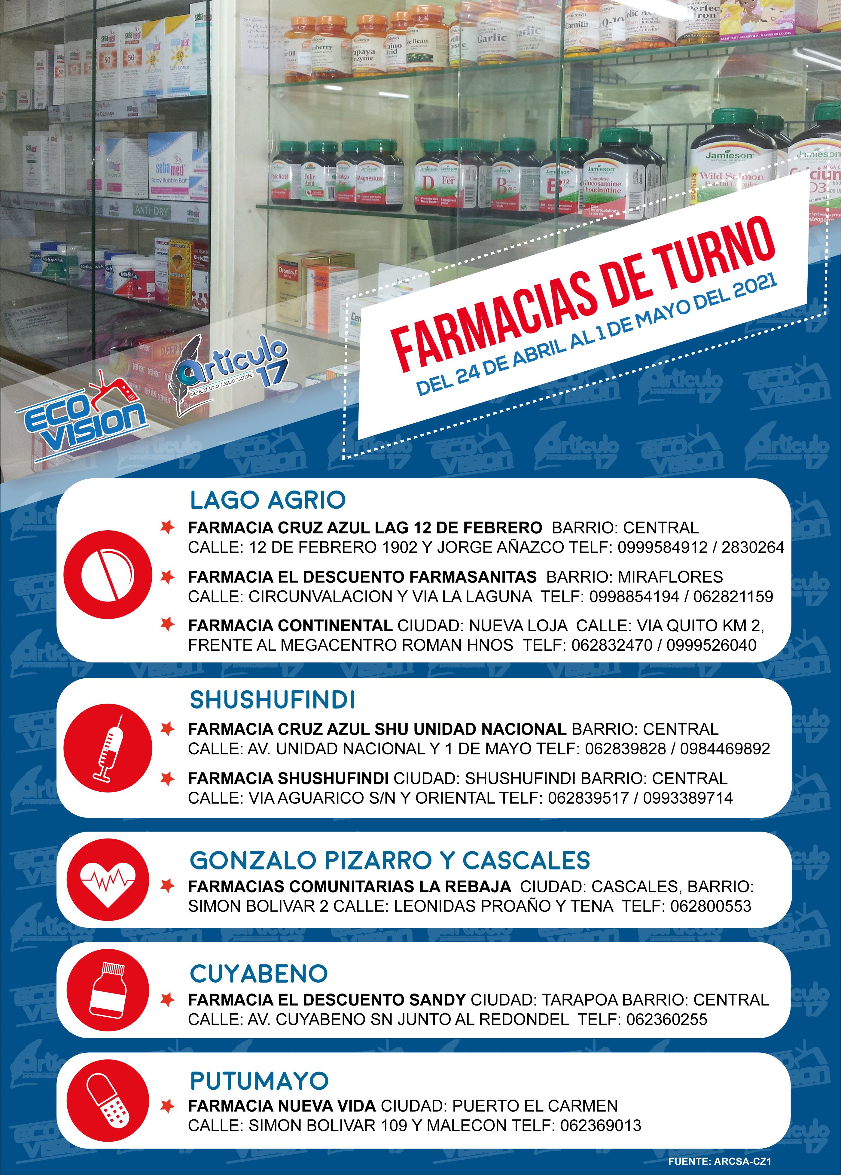Les compartimos el listado de las farmacias que estarán de turno del 24 DE ABRIL AL 1 DE MAYO del 2021 en la provincia de Sucumbíos. Pasa la voz y ayudemos a que las personas que requieran de este servicio sepan dónde acudir.