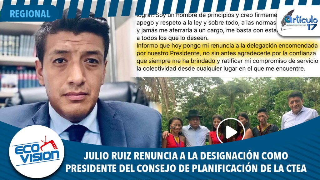 Finalmente Julio César Ruiz a dos días de su designación presentó su renuncia al cargo y haciendo público un comunicado en sus redes sociales manifestando: » La Amazonía ha sido mi segundo hogar donde he realizado importantes negocios, he hecho grandes amigos y he realizado actividad política, no dudo de su potencial y la calidad humana de sus habitantes, siempre cuentan conmigo, hay tanto por hacer y lograr. Soy un hombre de principios y creo firmemente en el estricto apego y respeto a la ley y sobre todo, a las normas morales y éticas y jamás me aferraría a un cargo, me basta con estar vivo para servir a todos los que lo deseen.Informo que hoy pongo mi renuncia a la delegación encomendada por nuestro Presidente, no sin antes agradecerle por la confianza que siempre me ha brindado y ratificar mi compromiso de servicio a la colectividad desde cualquier lugar en el que me encuentre».