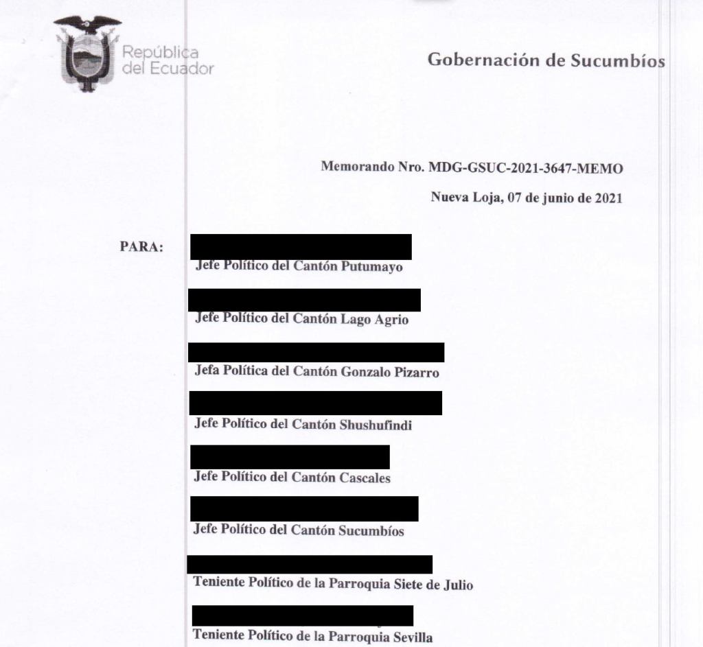 Con el propósito de reestructurar el aparato gubernamental en Sucumbíos, el gobernador Dario Domínguez, mediante memorando Nro. MDG-GSUC-2021-3647-MEMO, solicitó a los jefes y tenientes políticos, así mismo a intendencia y comisarías, presenten la renuncia los mismos que está bajo la modalidad de nombramiento de libre remoción.
